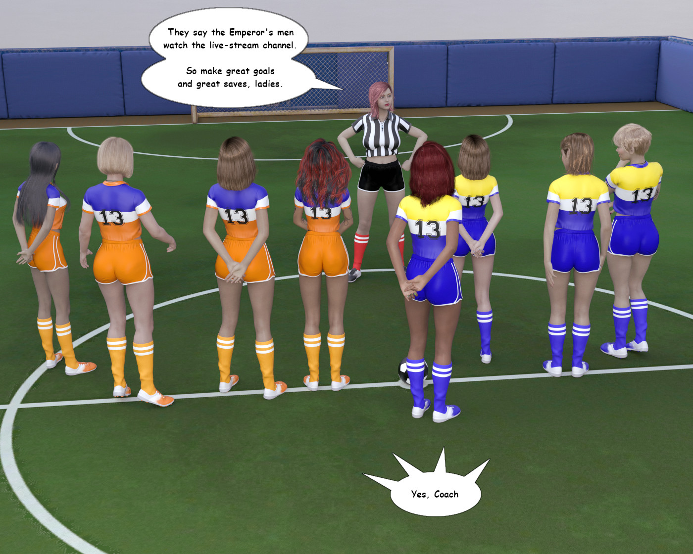 There is no nudity in the opening pages, but all the female characters end up being nude eventually. In this case the plot ensures that these beautiful ladies play a game in the buff. Stripping scenes are shown in the transition from clothed to naked.